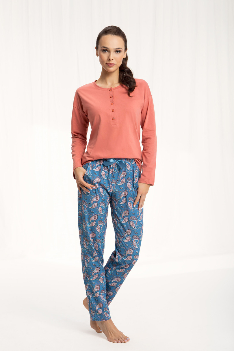 Жіноча піжама Luna, одноколірна блуза, застібка поло на 5 ґудзиків, круглий виріз, довгі рукави. Штани з принтом пейслі, довгі, бант на талії, кишені. Склад: 100% бавовна.