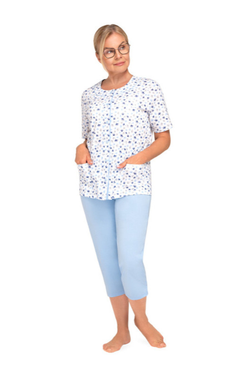 Піжама бавовняна з кишенями, застібається на гудзики, однотонні брюки, зручна гумка на талії, довжина 3/4