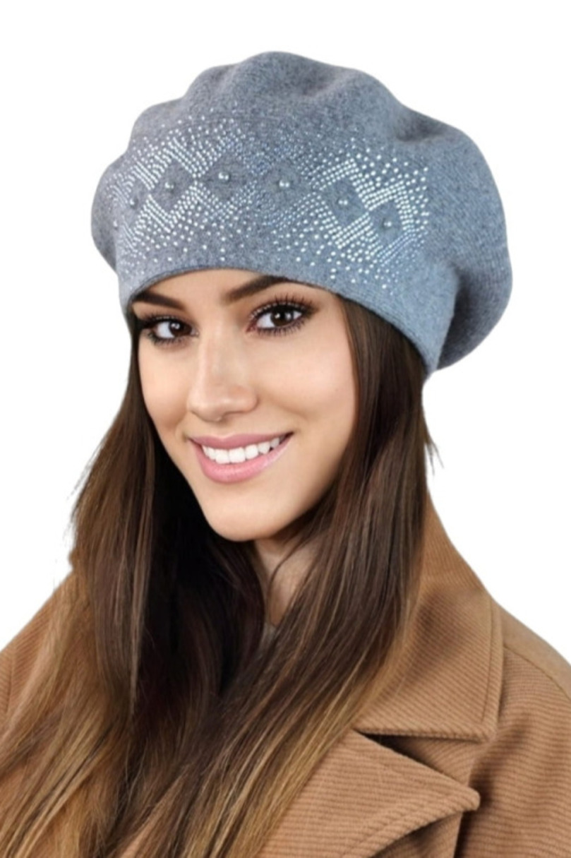 Берет з високоякісної вовняної пряжі. Завдяки дбайливій обробці він м'який і приємний на дотик. Феноменальний візерунок, створений мерехтливими стразами та підібраною за кольором половинкою перлини, засліплює, захоплює, привертає увагу. Виріб чудово лягає на голову, гарантує тепловий комфорт у холодні дні. Композиція: 80% шерсть; 20% поліамід