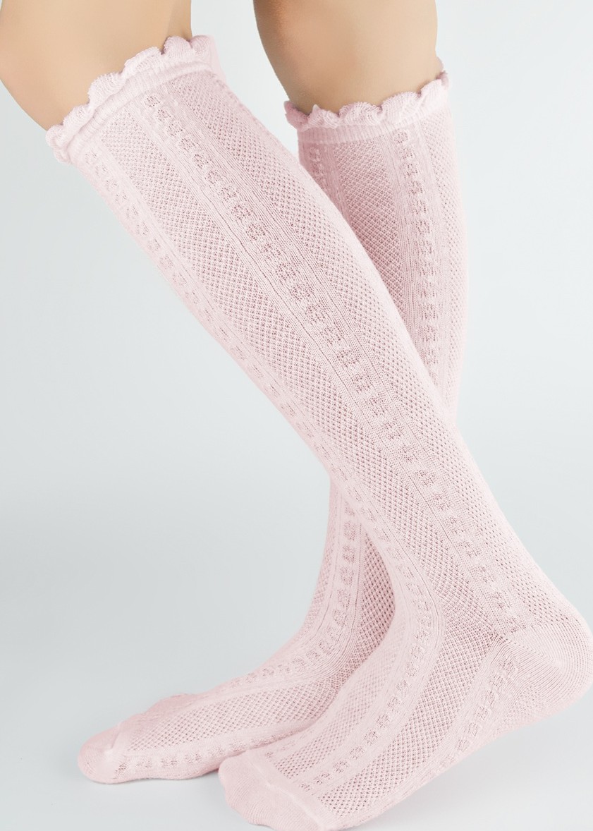 Дівчачі шкарпетки до коліна з м'якої трикотажної тканини, дуже приємні до шкіри. Прикрашений ніжним, ажурним візерунком. Кольори упаковані випадковим чином. Склад: 72% бавовна, 25% поліамід, 3% еластан.