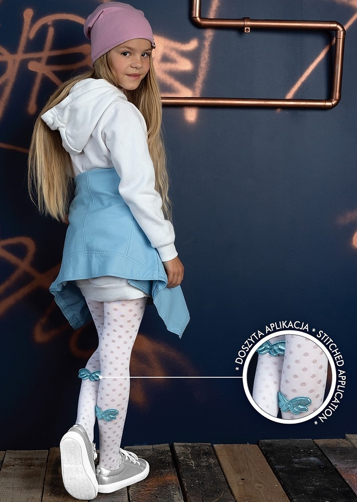 Колготки дівочі з малюнком, товщина 40 DEN. На них нашита аплікація у вигляді крил. Завдяки технології 3D вони дуже гнучкі, м'які та добре тримаються на ніжці. Склад: 94% поліамід, 65% еластан.