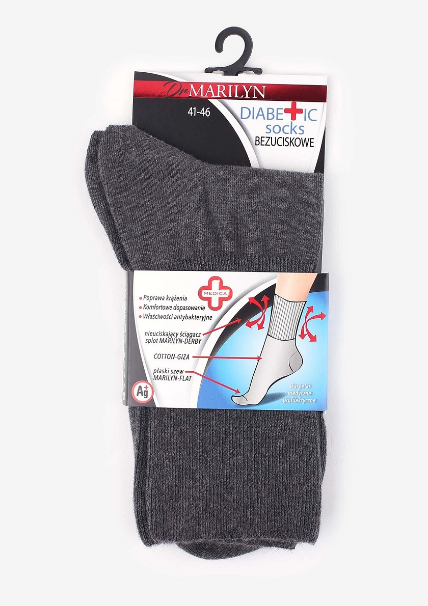 Профілактичні шкарпетки без тиску, виготовлені з бавовни найвищої якості, чудово регулюють температуру ніг – влітку вони залишаються прохолодними, а взимку – теплими. Вони мають антибактеріальні та протигрибкові властивості. Склад: 80% бавовна, 10% поліамід, 10% еластан