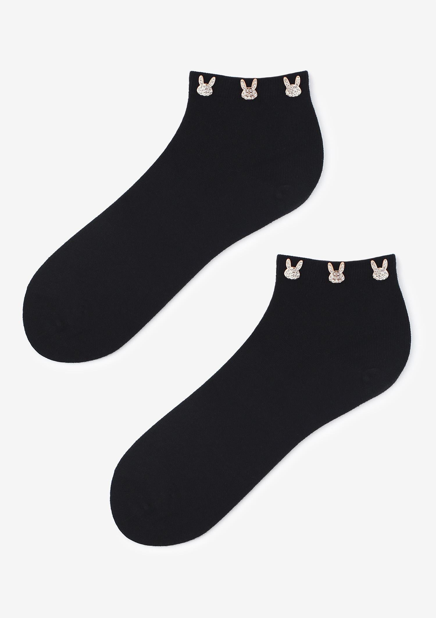 Жіночі шкарпетки до щиколотки з ювелірним декором кристалами у формі голови кролика. Виготовлений з натуральної бавовни найвищої якості. Плоский і м'який шов забезпечує комфорт при носінні Склад: 75% бавовна, 20% поліамід, 5% еластан