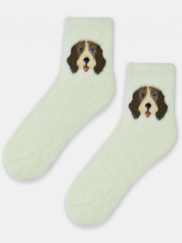 Шкарпетки для дівчинки із зображенням голови собаки виготовлені з м'якого трикотажу в поєднанні з пухнастою ниткою. Теплі та зручні, мають манжету, що не тисне. Змішані дизайни - надсилаються випадковим чином. Склад: 86% поліамід, 12% поліестер, 2% еластан.