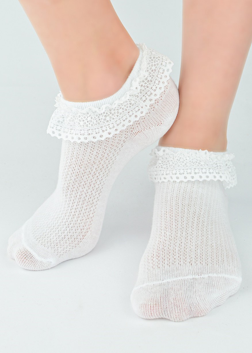 Шкарпетки для дівчинки з ніжної ажурної бавовни. Пояс, що не стискається, прикрашений мереживом. Склад: 75% бавовна, 22% поліамід, 3% еластан.