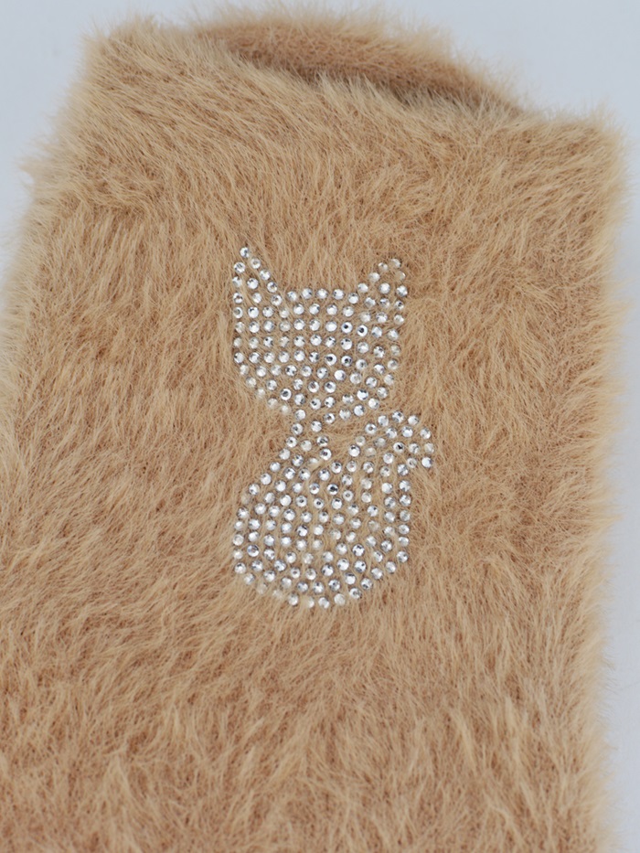 Жіночі шкарпетки з м'якої пухнастої тканини, прикрашені блискучою аплікацією з циркону у формі котика.