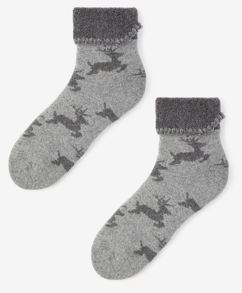 Теплі жіночі шкарпетки з малюнком стрибаючих оленів. Виготовлена з пряжі найвищої якості. Шкарпетки м'які та зручні. Вони мають складчастий, не стискаючий рант. Склад: 60% поліамід, 23% акрил, 7% віскоза, 5% шерсть, 3% ангора, 2% еластан.