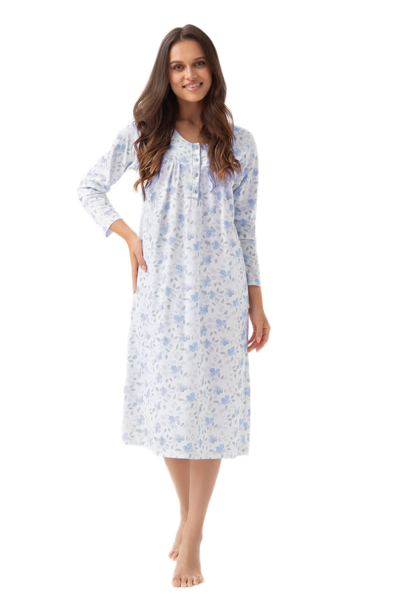 Жіноча нічна сорочка Luna 338 J/25 – це втілення жіночного стилю та комфорту. Квітковий візерунок та вільний крій забезпечують свободу рухів та задоволення від носіння. Ніжний V-подібний виріз з легким заокругленням та зібрана кокетка додають витонченого шарму. Застібка на чотири ґудзики дозволяє легко одягати її, а довжина до коліна робить нічну сорочку ідеальною для будь-якої пори року. Виготовлена з найякіснішої 100% бавовни, вона гарантує комфортний сон та природну повітропроникність.