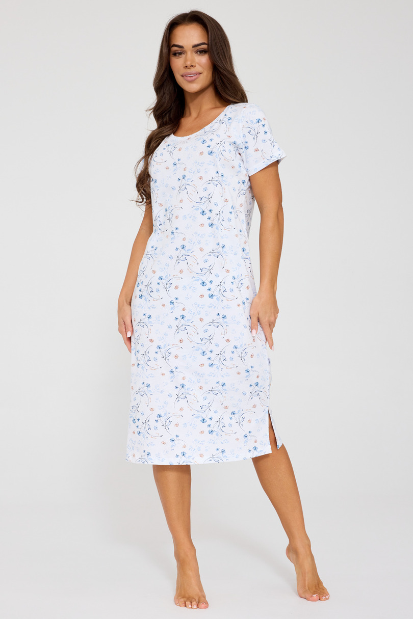 Жіноча нічна сорочка FLORENCE 2 799/351 поєднує в собі витонченість, жіночний стиль та максимальний комфорт. Виготовлена зі 100% високоякісної бавовни, вона м'яка, дихаюча та приємна до шкіри, що робить її ідеальною для сну та відпочинку вдома. Нічна сорочка з короткими рукавами до колін забезпечує комфорт навіть у теплі ночі. Ніжний квітковий візерунок надає дизайну романтичного та легкості. Бічні розрізи збільшують свободу рухів та підкреслюють жіночний силует. FLORENCE 2 – ідеальний вибір для жінок, які цінують натуральні матеріали, класичну форму та естетичні деталі. Нічна сорочка пошита та виготовлена в Польщі, що гарантує високу якість виготовлення та увагу до деталей.