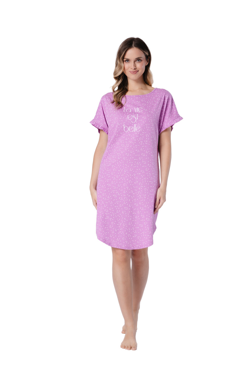 Жіноча нічна сорочка RENA 1716 від LEVEZA – це надзвичайно зручний та стильний варіант нічного одягу, виготовлений зі 100% натуральної бавовни. Легка, повітряна тканина забезпечує комфорт під час сну та щоденного відпочинку вдома, а ретельна обробка підкреслює жіночний характер дизайну. Нічна сорочка має тонкий виріз «бато», який елегантно підкреслює плечі та декольте. Короткі рукави із заниженими плечима та ніжна обробка з воланами додають легкості та романтичності. Модний принт зі слоганом у поєднанні з цікавим візерунком створює сучасний дизайн. Модель виконана в насиченому пурпуровому кольорі та прикрашена візерунком у формі неправильних трикутників, що надає нічній сорочці унікального характеру. Довжина нічної сорочки вище коліна, що забезпечує комфорт та свободу рухів. Ще однією унікальною особливістю є чітко заокруглений поділ, який красиво драпірується фігура. Нічна сорочка RENA 1716 – чудовий вибір для жінок, які цінують натуральні матеріали, комфорт та модний вигляд у своєму нічному одязі. Модель доступна в розмірах від M до 2XL, що забезпечує комфортну посадку для різних типів фігур.