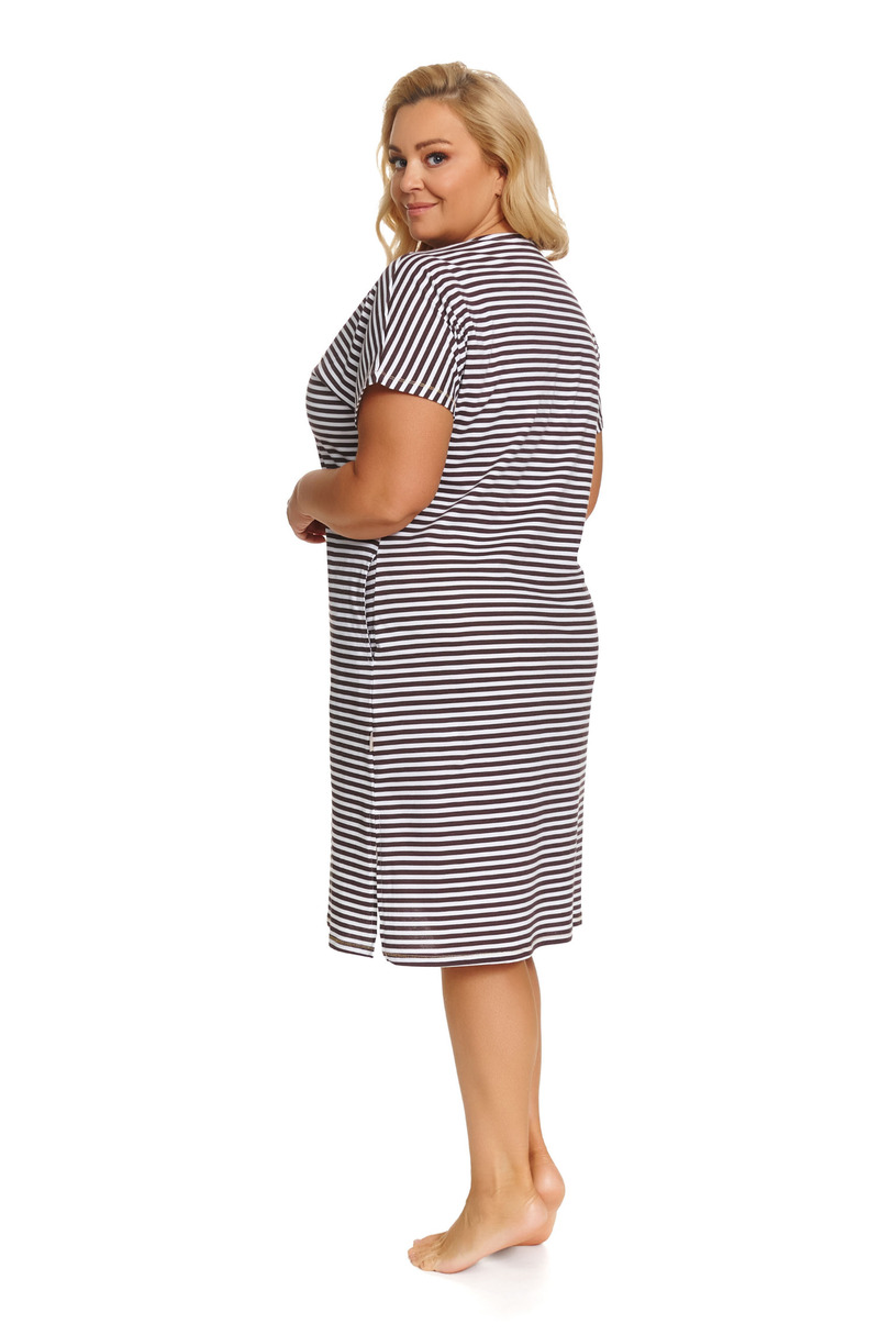 Жіноча нічна сорочка TB.7470 Dr Nap — це зручна та жіночна нічна сорочка, розроблена для фігур розмірів L-2XL. Вона ідеально поєднує комфорт, свободу рухів та витончені деталі, що підкреслюють жіночний характер, забезпечуючи ідеальну посадку навіть для жінок з повнішою фігурою. Ніжний візерунок у горизонтальну смужку стримано формує силует, а контрастний V-подібний виріз візуально стрункіша верхня частина тіла та підкреслює лінію декольте. Елегантна аплікація у формі золотого серця на грудях додає неповторного шарму. Практичні бічні кишені підвищують функціональність нічної сорочки, а бічний розріз забезпечує більшу свободу рухів під час ходьби та щоденного використання. Вільний, зручний крій м’яко облягає силует, не тиснучи, що робить її ідеальною як для сну, так і для відпочинку вдома. Виготовлена з високоякісної, м’якої та дихаючої бавовни, вона приємна для шкіри. Зроблено в Польщі. Тканина сертифікована за стандартом OEKO-TEX Standard 100.