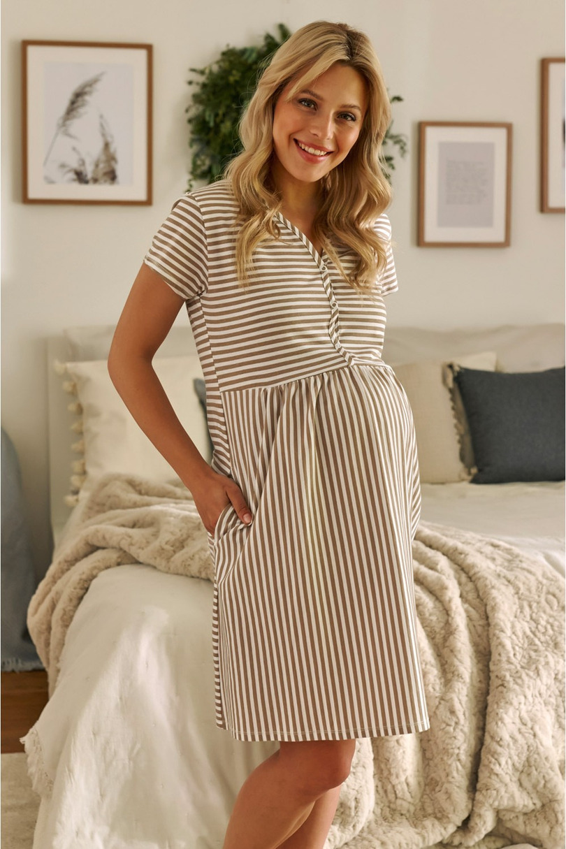 Жіноча сорочка TCB.9928 – ідеальне рішення для вагітних жінок та годуючих мам, які цінують комфорт і стиль. Ця сорочка, вирізняючись ніжними бежевими смужками, натхненними морським стилем, поєднує в собі позачасовий дизайн із практичними функціями, що спрощують повсякденне життя. Сорочка має функціональну застібку-кнопку, що дозволяє швидко та непомітно годувати – як вдома, так і в лікарні. Практичні кишені підвищують комфорт. Виготовлена зі 100% високоякісної бавовни, сорочка неймовірно м'яка, дихаюча та приємна для шкіри. Вона забезпечує оптимальну циркуляцію повітря та комфортний сон протягом усієї ночі. Її універсальний крій забезпечує ідеальну посадку під час вагітності та після пологів. Тканина сертифікована за стандартом OEKO-TEX Standard 100, що гарантує безпеку та відсутність шкідливих речовин. Її стильний вигляд також робить її ідеальним та елегантним подарунком для майбутньої мами. Склад: 100% бавовна