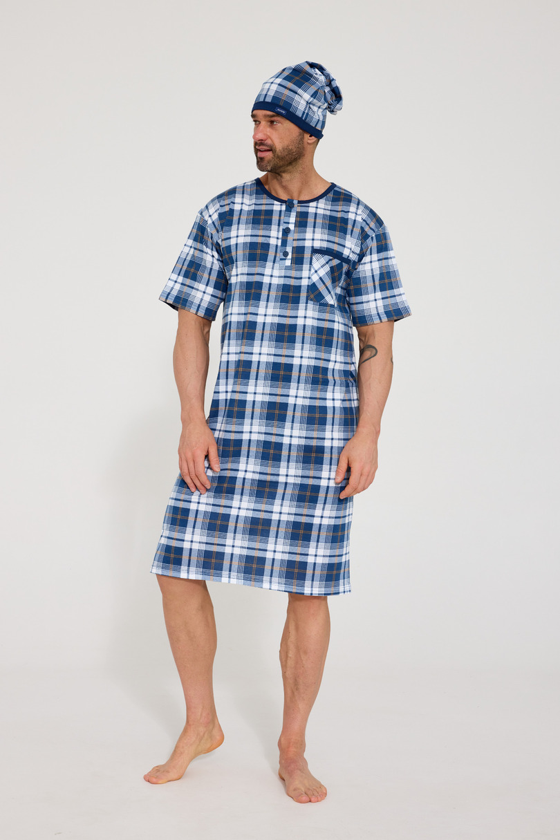 Чоловіча нічна сорочка KR 109 W/26 – це класичний вибір для чоловіків, які цінують комфорт і традиційний стиль сну. Виготовлена зі 100% натуральної бавовни, вона м'яка, дихаюча та приємна для шкіри. Модель з короткими рукавами та вирізом на ґудзиках забезпечує свободу рухів та комфорт. Практична кишеня розташована на грудях. Нічна сорочка доступна в картатому або візерунчастому варіанті, що надає їй позачасового характеру. Нічний ковпак у тон доповнює образ, додаючи класичного шарму старої школи.