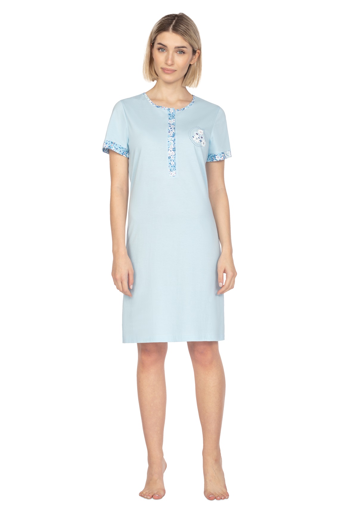Жіноча бавовняна сорочка з високоякісної бавовни. Горловина кругла, застібається на гудзики, рукави короткі. Виріз горловини, манжети та планка на ґудзиках оброблені бавовною з квітковим мотивом. Склад: 100% бавовна.