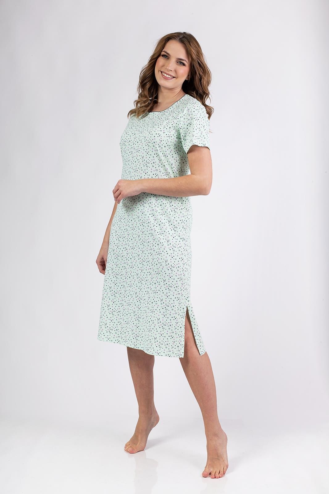 Жіноча бавовняна сорочка з коротким рукавом з сердечками. Круглий виріз, короткі рукави, довжина до коліна. Невеликі розрізи з боків. Склад: 100% бавовна.