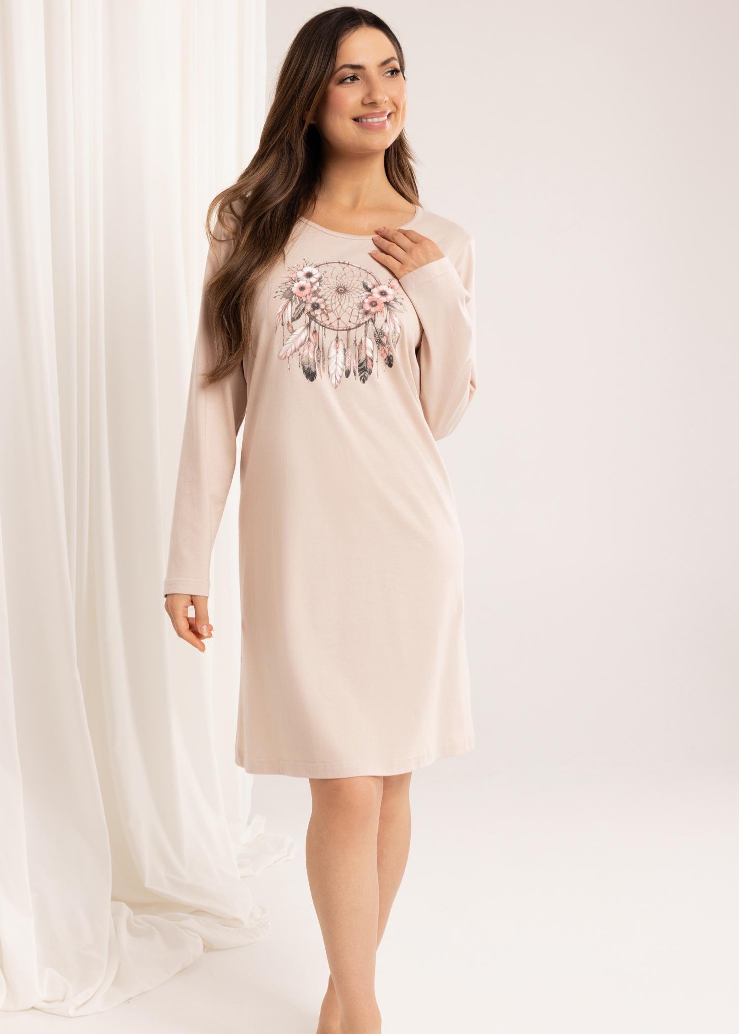 Жіноча бавовняна сорочка з довгим, округлим вирізом горловини та принтом спереду. Довжина вище коліна. Склад: 100% бавовна.