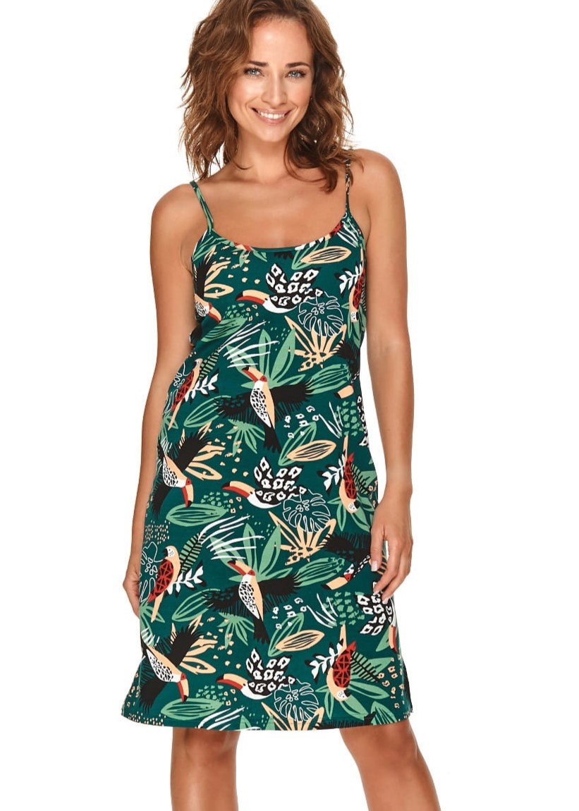 Нічна сорочка на вузькому лямці з високоякісної бавовни. Гарний візерунок з туканами. Склад: 100% бавовна.