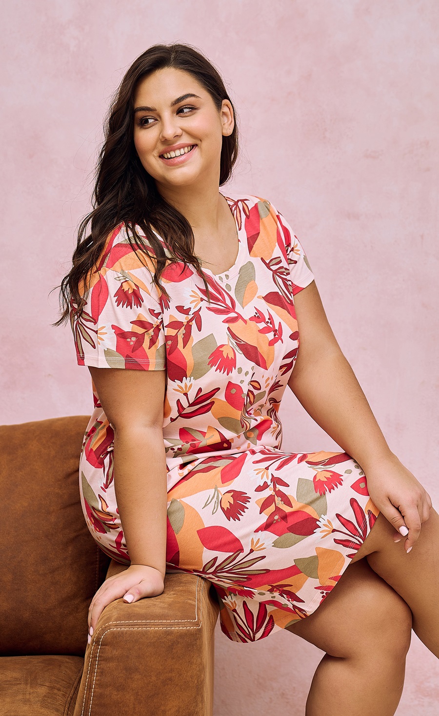 Жіноча бавовняна сорочка з коротким рукавом. Строкатий візерунок з геометричними квітами. Довжина до коліна, розрізи внизу. Склад: 100% бавовна.