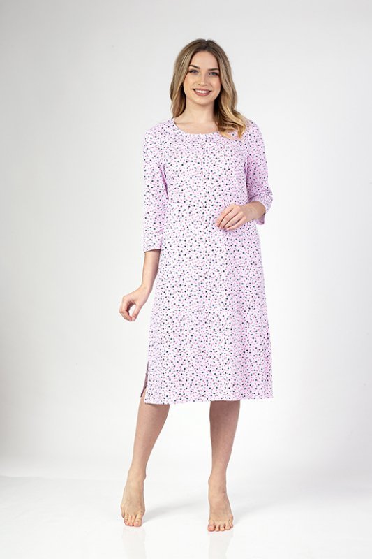 Жіноча сорочка з візерункової приємної до тіла бавовни з дрібними квіточками. Напівкруглий виріз, рукав 3/4, довжина до коліна. Знизу з двох сторін прорізи. Склад: 100% бавовна.