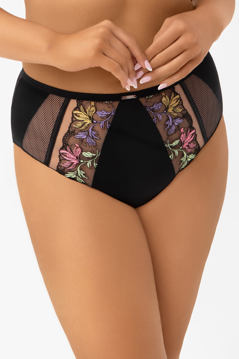 • Висока талія • Високий виріз, що покриває майже всі сідниці • Виготовлено з непрозорої мікрофібри в поєднанні з вишивкою та еластичним мереживом • Спинка оброблена плоским загинанням країв мікрофібри • Сріблясті металеві елементи (без нікелю) • Бавовняний промежинний край Склад: 90% поліамід, 7% еластан, 3% поліестер