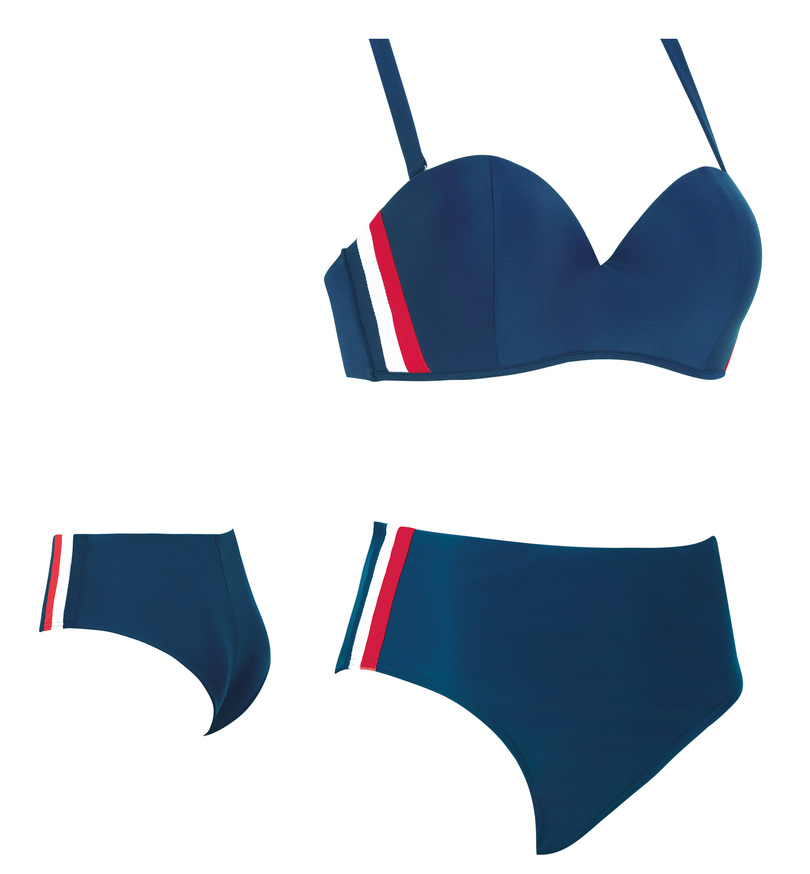 Двосекційний купальник виготовлений з високоякісної мікрофібри з додаванням лайкри. Бюстгальтер-балконет на кісточках з підкладкою застібається ззаду та має регульовані знімні бретельки. Візерунчасті трусики входять до комплекту, що відповідають кольоровій гамі бюстгальтера. Склад: 78% поліамід, 22% еластан.