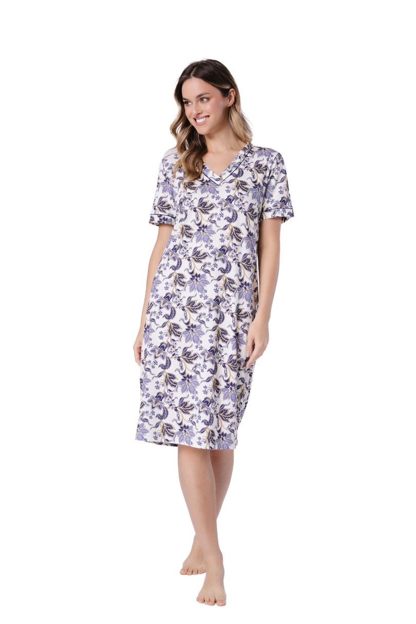 Жіноча сорочка Ilona 1739 від Leveza – це елегантний та зручний варіант для жінок, які цінують класичний стиль та найвищий рівень комфорту. Виготовлена зі 100% рафінованої бавовни, вона надзвичайно м'яка, гладка та приємна до шкіри, а також забезпечує чудову повітропроникність. V-подібний виріз ніжно підкреслює жіночний силует, а короткі рукави з манжетами надають сорочці елегантності. Контрастна окантовка в поєднанні з квітковим візерунком у кольорах екрю та темно-синього створює позачасовий, стильний образ. Довжина до коліна робить сорочку ідеальною як нічна сорочка, так і зручний одяг для дому.