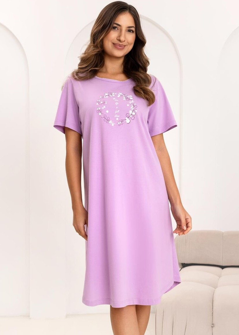 Жіноча бавовняна сорочка з принтом спереду. Приємна на дотик, м'яка та еластична, вона забезпечує комфорт протягом усієї ночі, не обмежуючи рухів. Круглий виріз, короткі рукави та довжина до коліна. Склад: 100% бавовна.