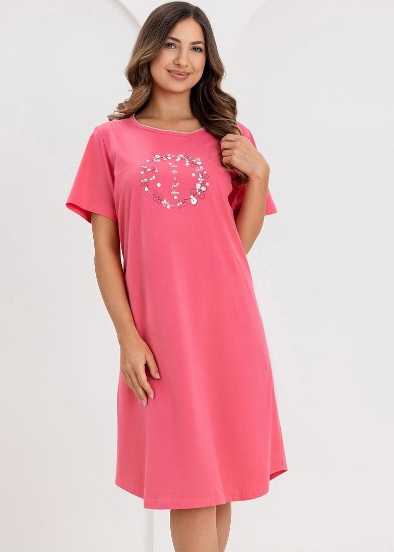 Жіноча бавовняна сорочка з принтом спереду. Приємна на дотик, м'яка та еластична, вона забезпечує комфорт протягом усієї ночі, не обмежуючи рухів. Круглий виріз, короткі рукави та довжина до коліна. Склад: 100% бавовна.