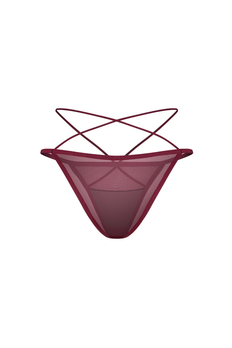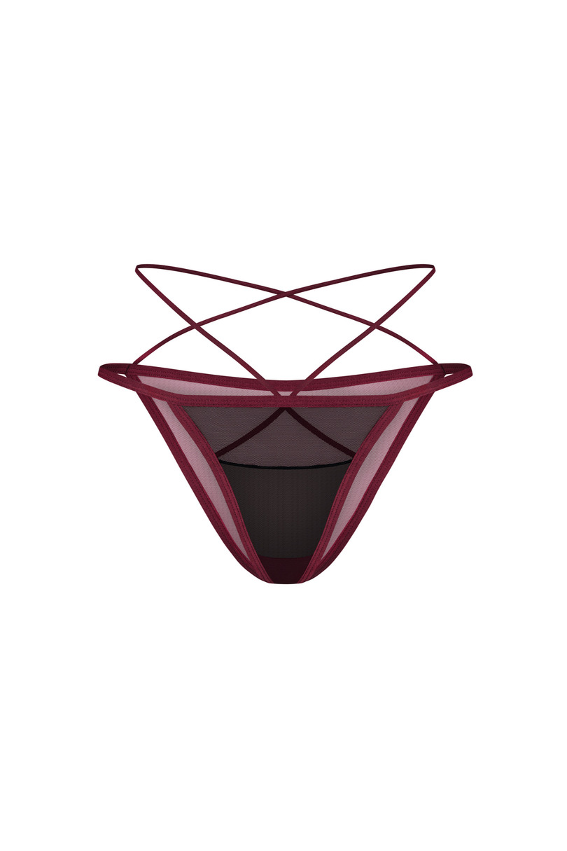 Міні-трусики Parisel – це витончений, але неймовірно чуттєвий предмет жіночої білизни, що полонить своїм сучасним дизайном та елегантними деталями. Бордовий колір у поєднанні з чорними акцентами створює вишуканий контраст, а ніжна окантовка на лінії стегон чудово підкреслює силует. Прозора сітка надає всьому виробу легкості та виняткової жіночності. Тонкі бретельки, що перетинаються спереду та ззаду, привертають погляд і додають міні-трусикам нотку оригінальності, водночас ніжно формуючи стегна. М'яка, еластична тканина забезпечує високий комфорт та ідеальну посадку. Міні-трусики Parisel ідеально поєднуються з бюстгальтером або корсетом з тієї ж колекції, створюючи цілісний, розкішний комплект білизни.