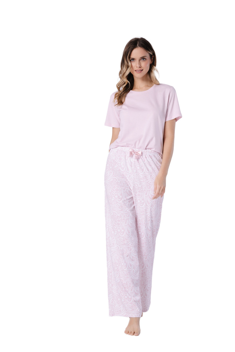 Жіноча піжама Dalia 1711 від Leveza – це елегантний та неймовірно зручний варіант для жінок, які цінують свободу та витончену естетику. Виготовлена зі 100% натуральної бавовни, вона м’яка, дихаюча та приємна до шкіри, забезпечуючи комфорт протягом усієї ночі. Топ з короткими рукавами та класичним круглим вирізом горловини однотонного пудрово-бежевого кольору пропонує мінімалістичний та стильний образ. Довгі штани широкого крою мають квітковий візерунок та декоративний бант на талії, що надає їм жіночності та легкості. Це ідеальна піжама для весняно-літнього сезону, ідеально підходить як для сну, так і для відпочинку вдома.