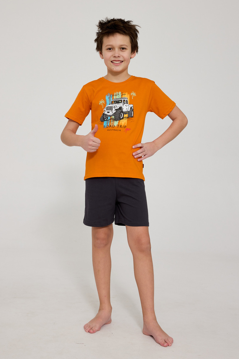 Піжама для хлопчика YOUNG KR 476/124 ROAD TRIP 2 – це зручний та стильний комплект нічного одягу, розроблений з урахуванням щоденного комфорту вашої дитини. Виготовлена зі 100% високоякісної бавовни, вона м’яка, дихаюча та ніжна до шкіри. Футболка з короткими рукавами має привабливий принт на грудях, що надає піжамі сучасного, молодіжного вигляду. Комплект включає короткі однотонні шорти для свободи рухів та комфорту під час сну. Піжама упакована в естетично привабливу коробку, що робить її ідеальним подарунком.