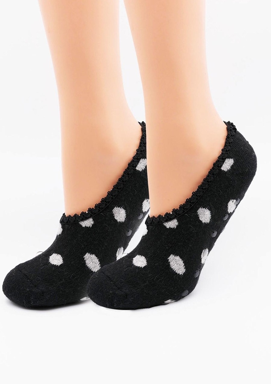 Короткі шкарпетки з ангори та суміші вовни, прикрашені яскравим горошок. Підошви мають нековзні вставки для додаткового комфорту та безпеки. Склад: 60% поліестер, 23% акрил, 7% віскоза, 3% ангора, 2% еластан.