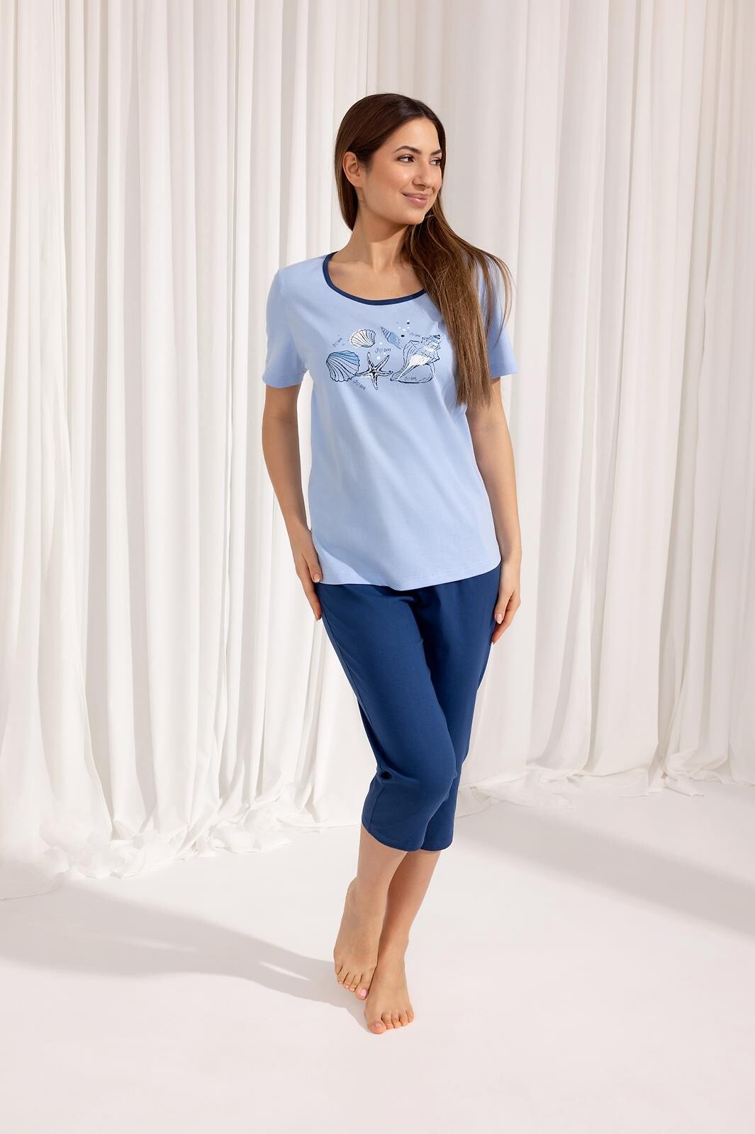 Жіноча піжама з короткими рукавами, круглим вирізом, спереду прикрашена ніжним принтом. Однотонні брюки довжиною 3/4 доповнять комплект. Склад: 100% бавовна
