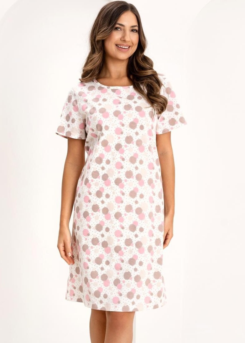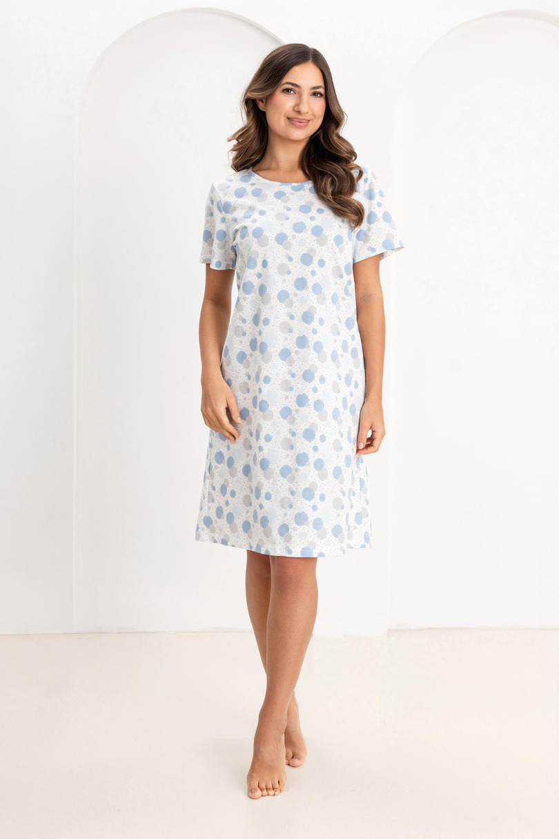 Жіноча нічна сорочка з простим, позачасовим дизайном, який забезпечує винятковий комфорт. Яскраві кольори та тонкий, ніжний візерунок надають їй легкості та жіночності. Короткі рукави та довжина до колін роблять цю нічну сорочку ідеальною для носіння цілий рік. Вільний крій забезпечує необмежений рух, що робить її ідеальним вибором як для сну, так і для відпочинку вдома. Склад: 100% бавовна
