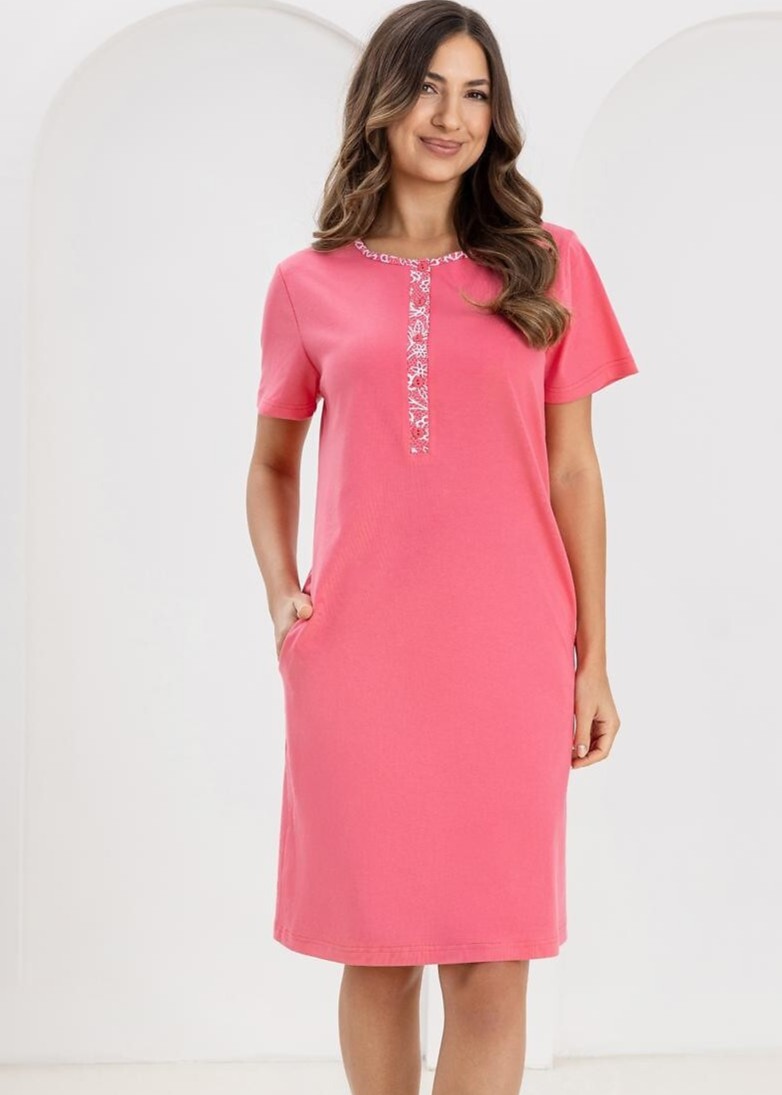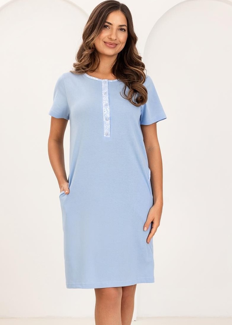 Класична жіноча нічна сорочка простого, зручного крою, ідеально підходить для щоденного сну та відпочинку вдома. Доступна в ніжних пастельних відтінках: блакитному, рожевому та персиковому, дизайн легкий та витончений. Короткі рукави та довжина до колін забезпечують свободу рухів та комфорт. Ніжний мереживний виріз підкреслює жіночний стиль нічної сорочки, а практичні кишені підвищують її функціональність. Ідеальний вибір для будь-якої пори року для жінок, які цінують комфорт та класичну елегантність. Склад: 100%