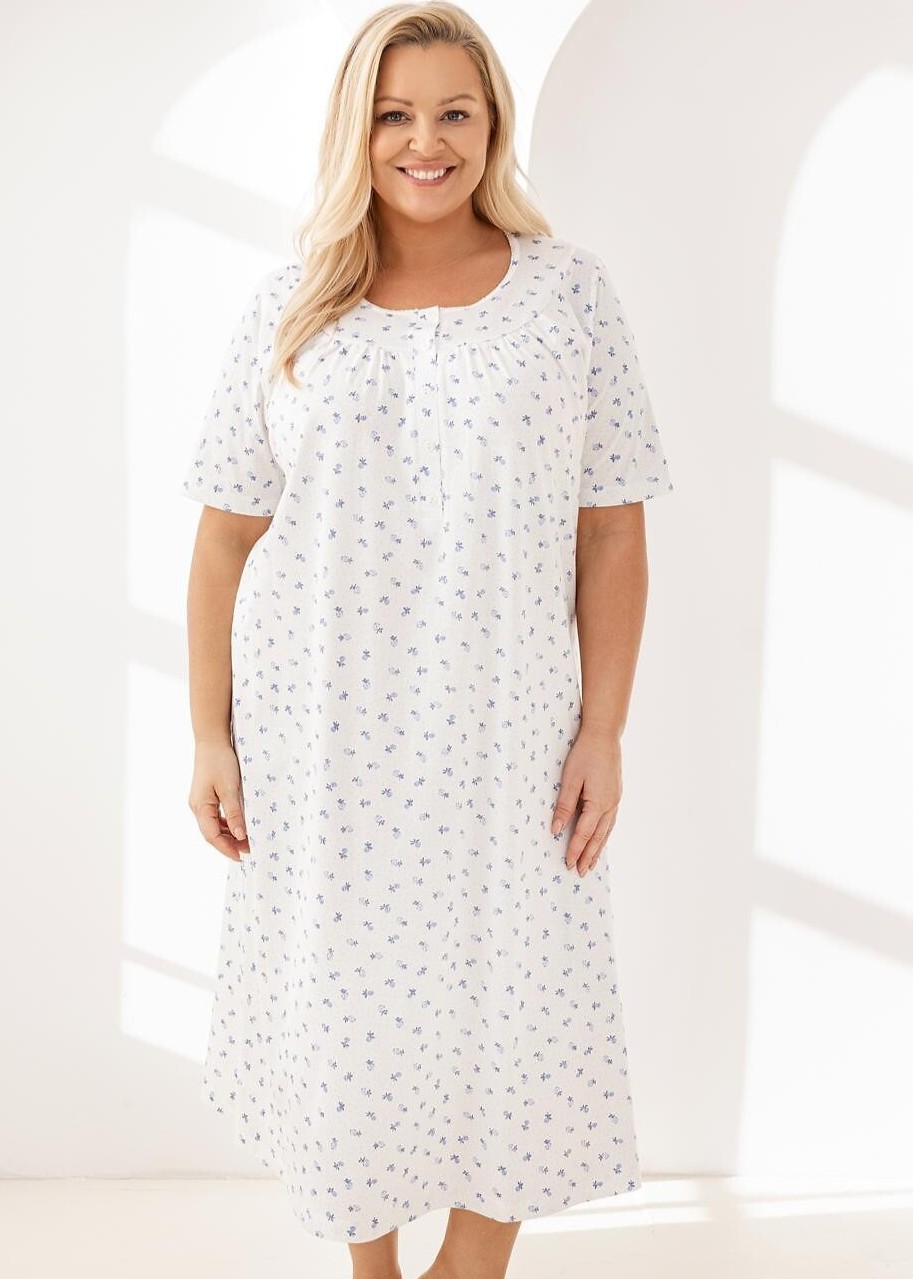 Жіноча сорочка з високоякісної бавовни з ніжним візерунком, м'яка та приємна на дотик. Має виріз горловини на ґудзиках, м'яко зібрану кокетку та короткі рукави. Склад: 100% бавовна.