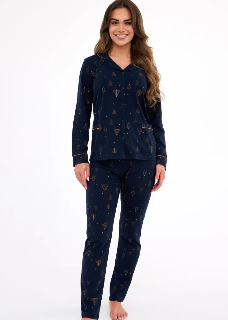 Жіноча піжама DR 482/447 GOLD від Cornette – це ідеальне поєднання елегантності, комфорту та якості. Виготовлена з ніжної 100% бавовни, вона приємна для шкіри та ідеально підходить для носіння цілий рік. Сорочка з довгими рукавами, елегантним коміром та застібкою на ґудзики додає класичного вигляду, а довгі штани прямого крою з кишенями гарантують повний комфорт. Упакована в естетично привабливу коробку, вона також стане чудовим подарунком – для себе або коханої людини.