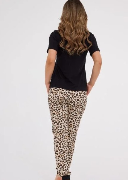 Жіноча піжама PANTHER 3 KR 730/440 – це стильний та зручний варіант для гарного нічного сну та домашнього відпочинку. Виготовлена повністю з натуральної бавовни, вона гарантує приємне облягання тіла та чудову повітропроникність. Верх комплекту – класична однотонна футболка з короткими рукавами та чарівною кишенею на грудях. Низ – це довгі штани з модним леопардовим візерунком, оснащені еластичним поясом та шнурком для зав'язування, що забезпечує ідеальну посадку. Практичні кишені на стегнах та манжети внизу штанин додають піжамі не тільки комфорту, але й сучасного характеру. Вся річ упакована в елегантну коробку – вона також чудово підійде як подарунок.