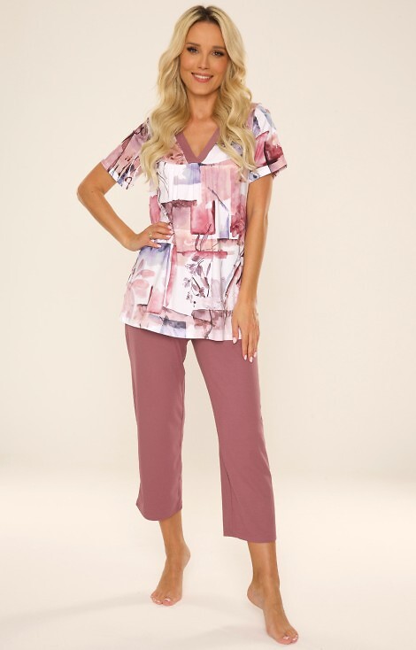 Жіноча піжама з коротким рукавом, з візерункової віскози з еластаном. У комплект входять одноманітні брюки довжиною 3/4. Склад: 94% віскоза, 6% еластан