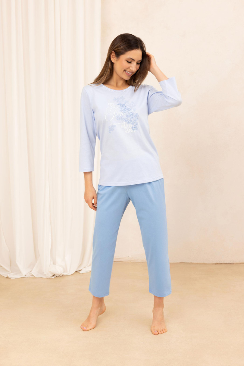 Жіноча бавовняна піжама. Футболка з напівкруглим вирізом горловини та рукавами 3/4, декоративний принт спереду. Однотонні штани довжиною 7/8 у тон. Склад: 100% бавовна.