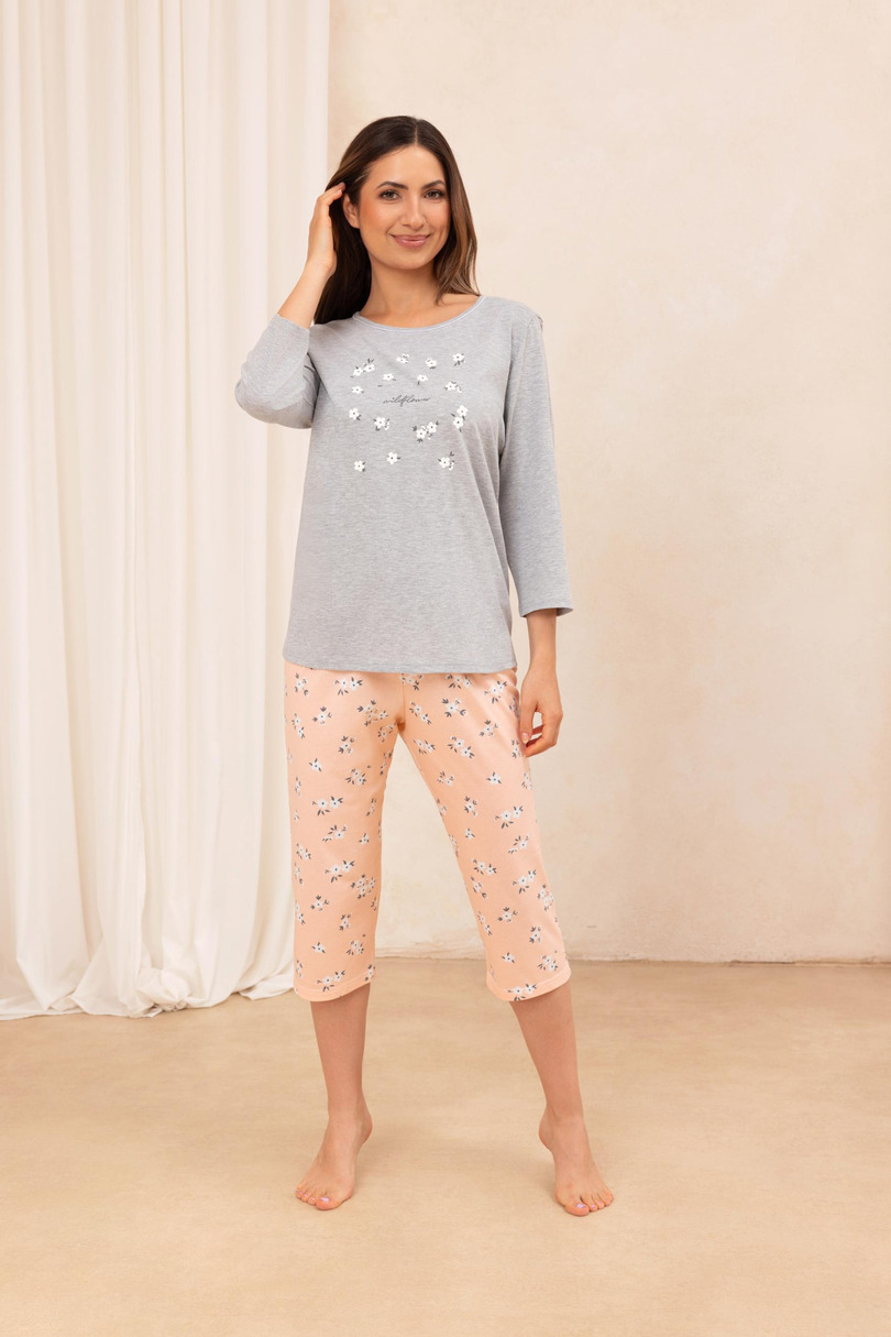 Бавовняна піжама для жінок. Футболка з круглим вирізом та рукавами 3/4, декоративний квітковий принт спереду. Штани 3/4 з візерунком у тон. Склад: 100% бавовна.