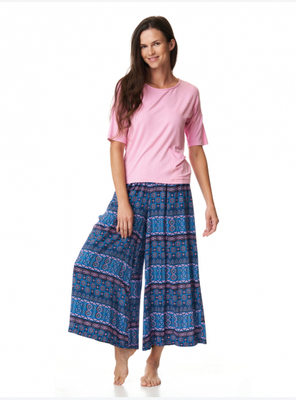 Жіноча піжама з високоякісної бавовни. Гладка блузка з рукавом 7/8, брюки з малюнком довжиною 7/8. С..