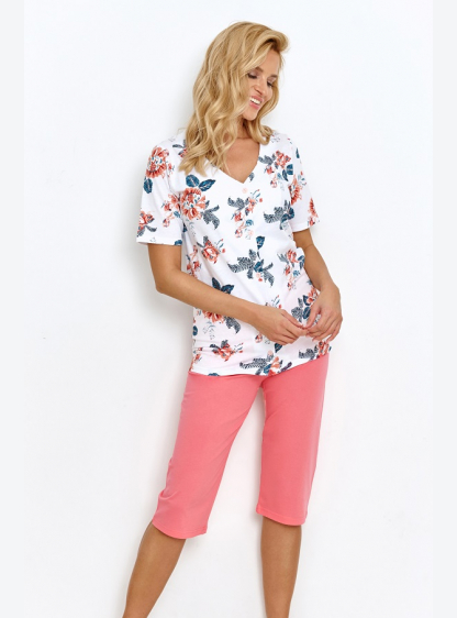 Жіноча піжама з високоякісної бавовни. Короткі рукави, укорочені брюки. Прикрашена ніжною аплікацією..