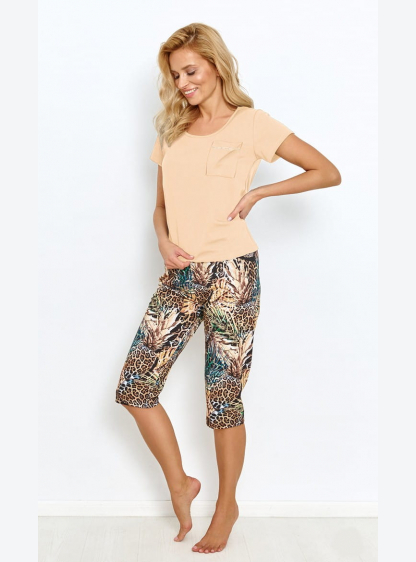 Жіноча піжама з високоякісної бавовни. Гладка блузка з коротким рукавом, брюки з малюнком, довжина 3..