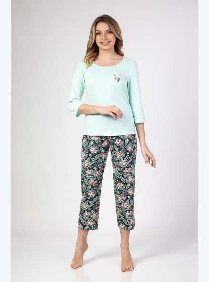 Жіноча піжама з рукавом 3/4, спереду прикрашена принтом. У комплект входять штани з малюнком довжино..