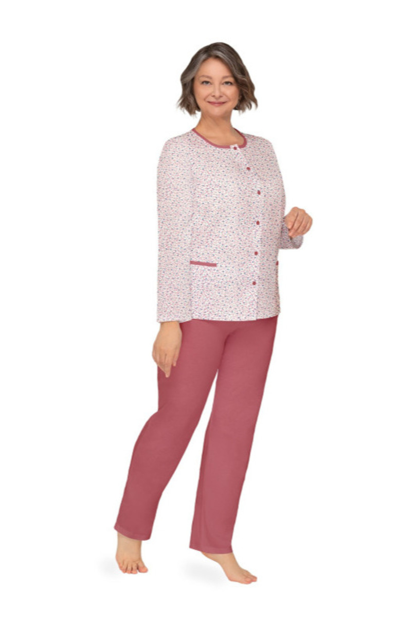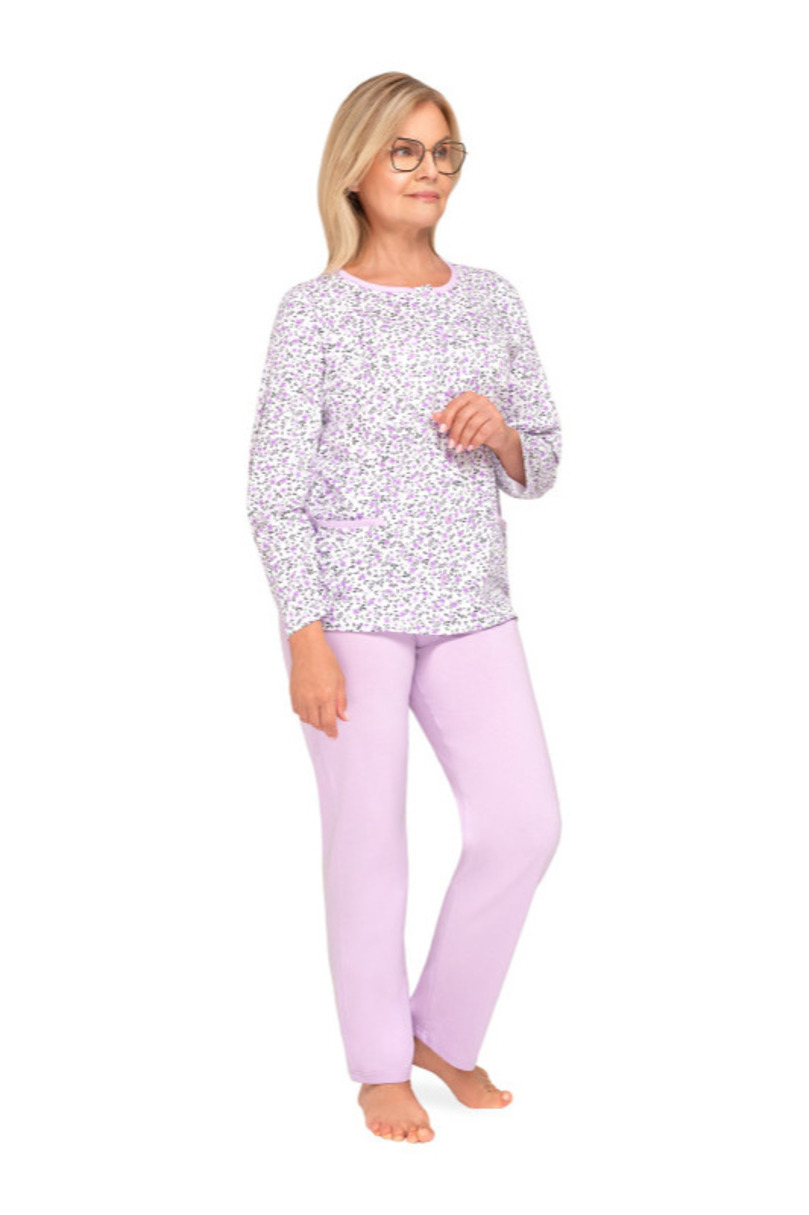 Жіноча піжама Kasia 267 – це ідеальне поєднання комфорту та елегантності для будь-якої пори року. Виготовлена зі 100% високоякісної бавовни, вона м'яка, дихаюча та приємна до шкіри. Футболка з довгими рукавами, візерунчастим дизайном та круглим вирізом горловини забезпечує стильний вигляд, а повна планка на ґудзиках дозволяє легко одягати піжаму. Однотонні довгі штани зі зручним еластичним поясом забезпечують свободу рухів та ідеальну посадку. Це ідеальний вибір для жінок, які цінують комфорт та класичний стиль! Склад: 100% бавовна
