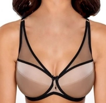 Бюстгальтер push-up зі знімними накладками. Чашки виготовлені з блискучої мікрофібри, оброблені чорними обробками. У верхній лінії витончена сітка з фатину, що перетворюється на ремінець. Гладкі боки, незнімні погони.