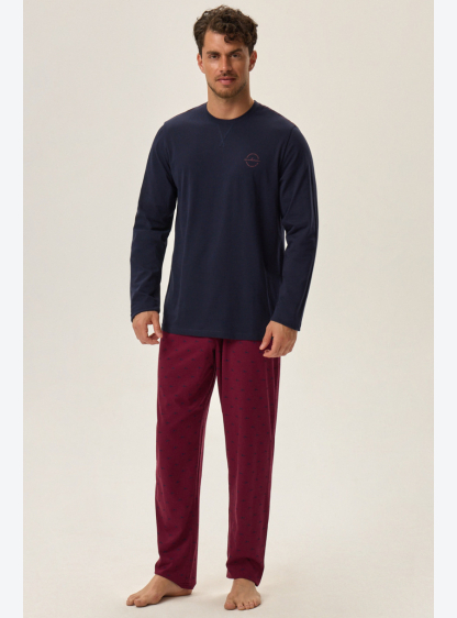 Зручна бавовняна піжама для чоловіків. Візерунчаста футболка з довгими рукавами та V-подібним вирізо..
