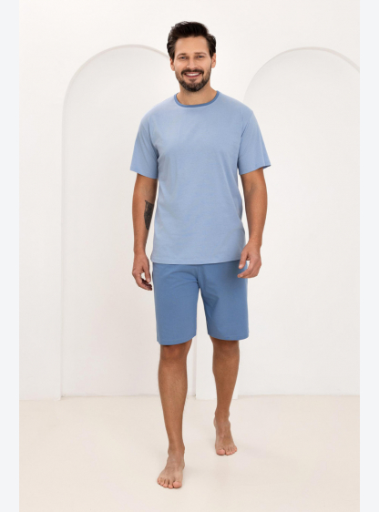 Чоловіча піжама з короткими рукавами. Верх однотонний з ніжним принтом, а круглий виріз горловини об..