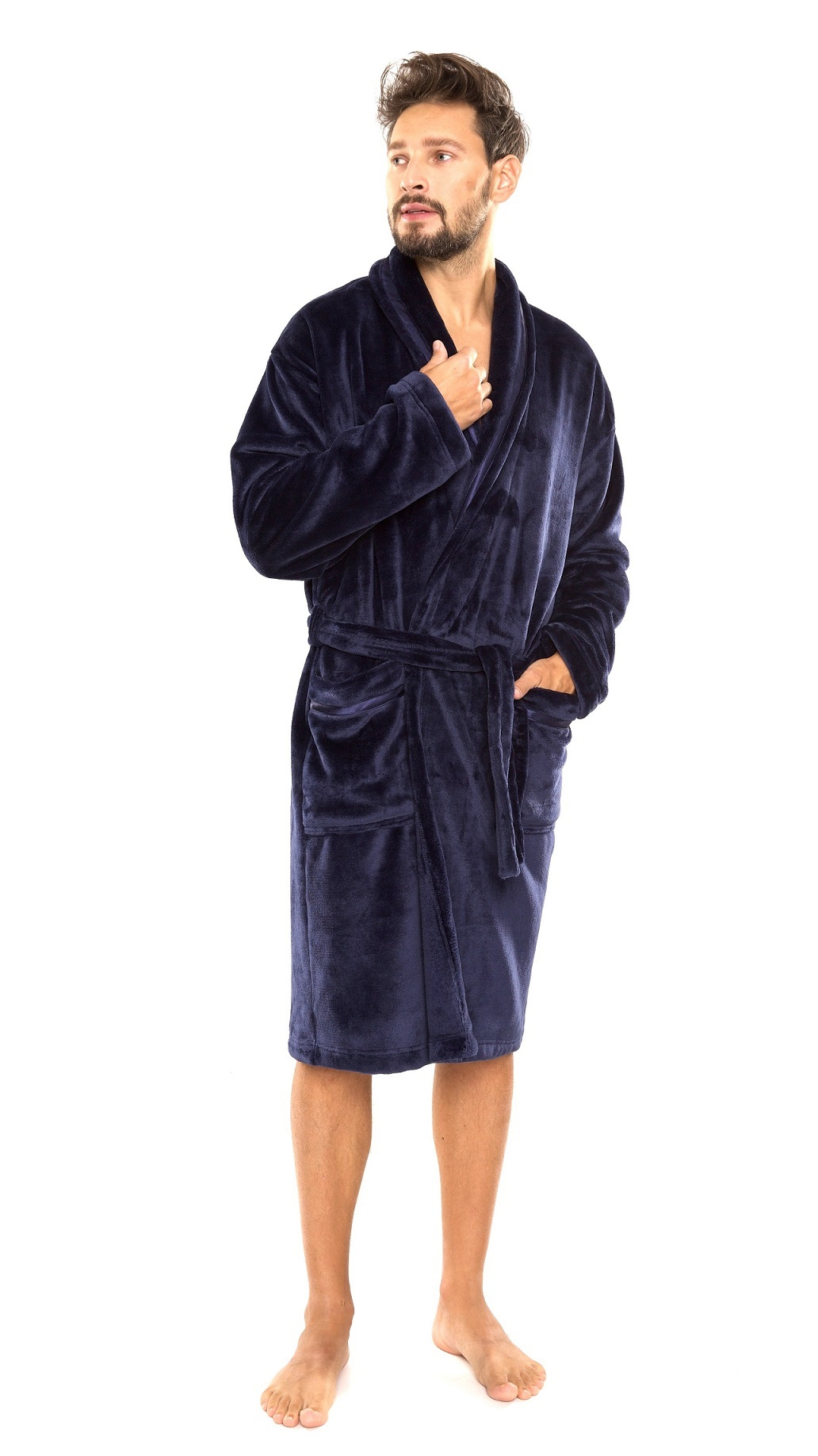 Чоловічий халат з приємної м'якої тканини, з шалевим коміром. Вставки на кишенях і комірі, зав'язуються на талії, кишені на стегнах. Склад: 100% поліестер.